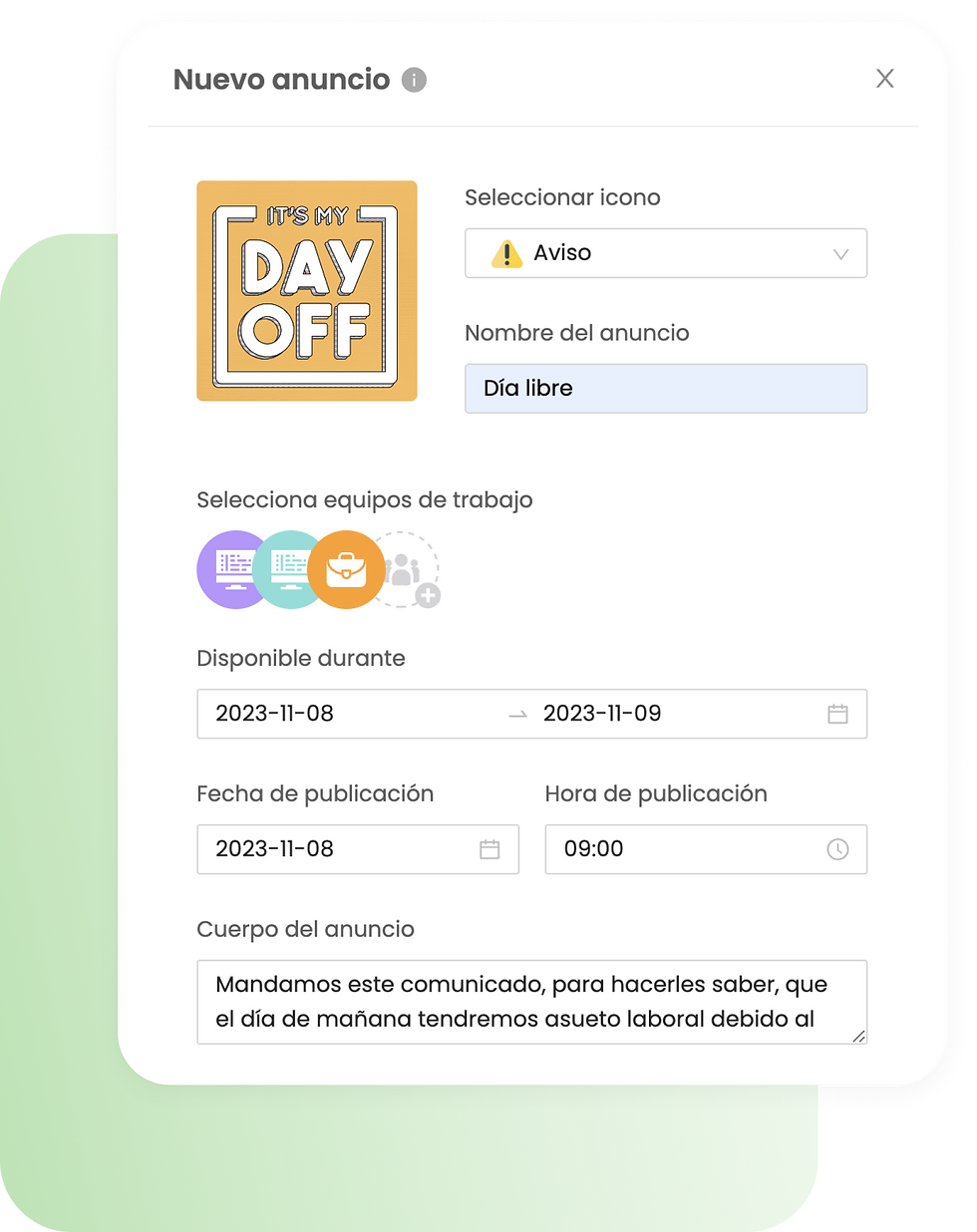 Crea anuncios de todo tipo para informar a tus colaboradores, podrás seleccionar una imagen, un ícono y un título que represente al anuncio.